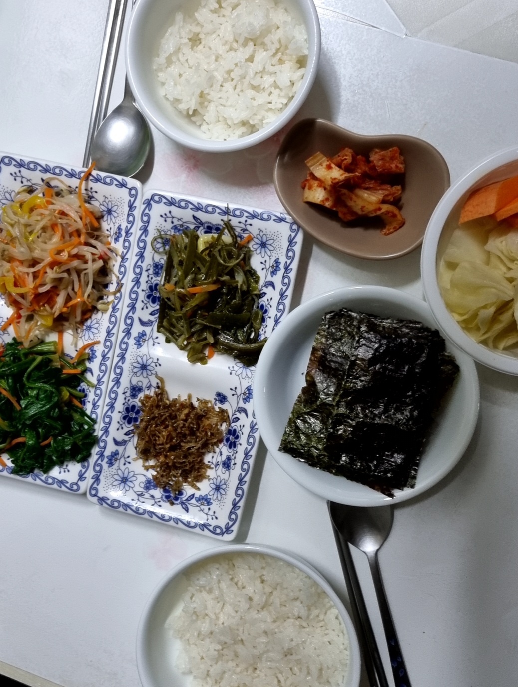 콩나물 무침, 미역줄기 볶음. 시금치 나물,